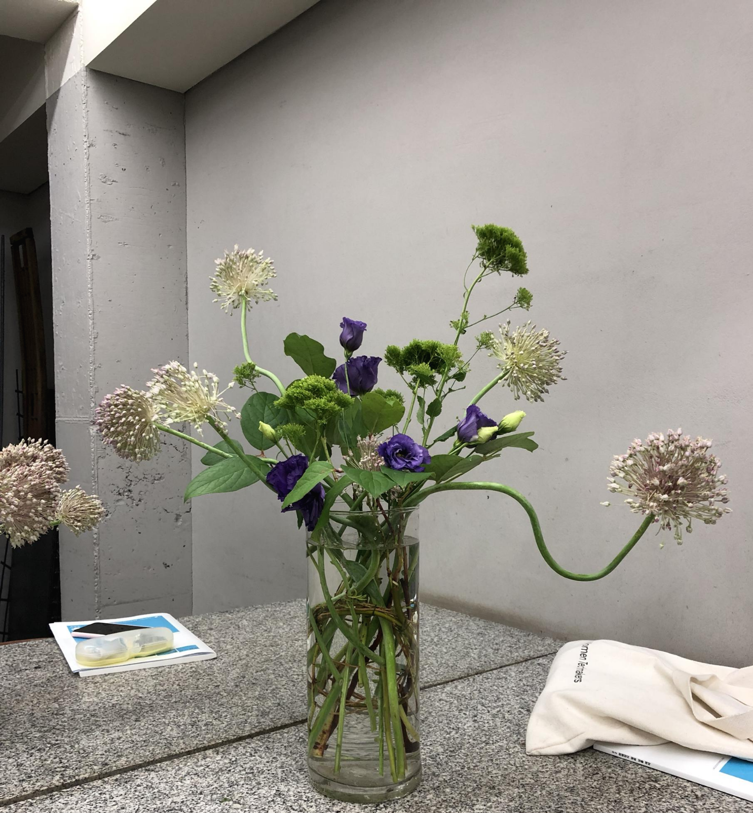 요즘 다니는 플라워학원에서 이 날은 병꽂이를 했다. 여름 분위기 물씬.. ㅎㅎ 병꽂이는 그냥 꽂으면 될 줄 알았는데 잘 고정도 되어야 한다고..안에 구조물을 만들어 넣었다. 덩굴을 잘 마사지해서 둥글게 만들어주고 사이사이 재료들을 꽂아주면 됨